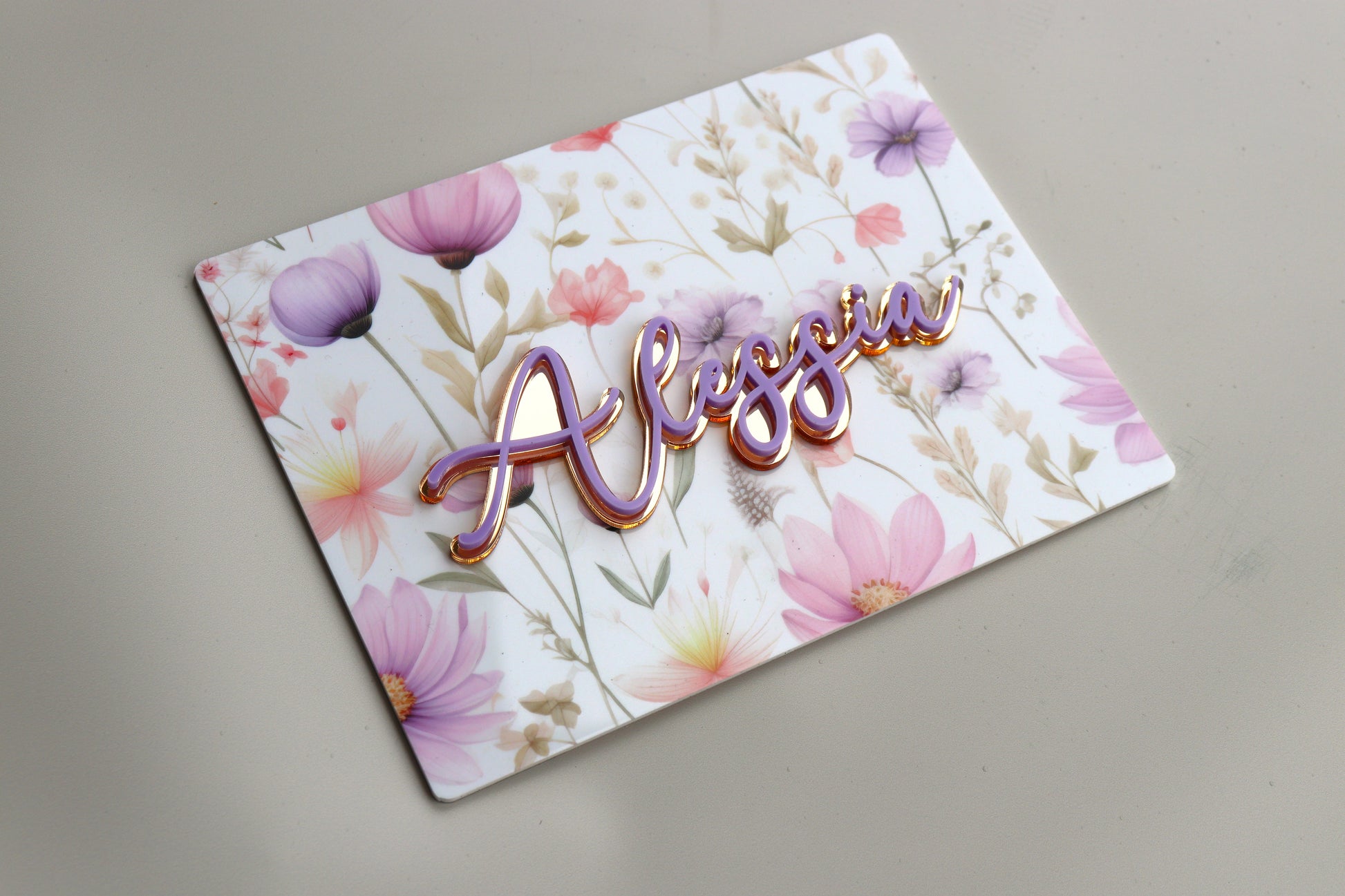 Please select a font style as well as a back and front colour for the acrylic layered name. (Colours advertised are Gold Mirror and Pastel Purple)
