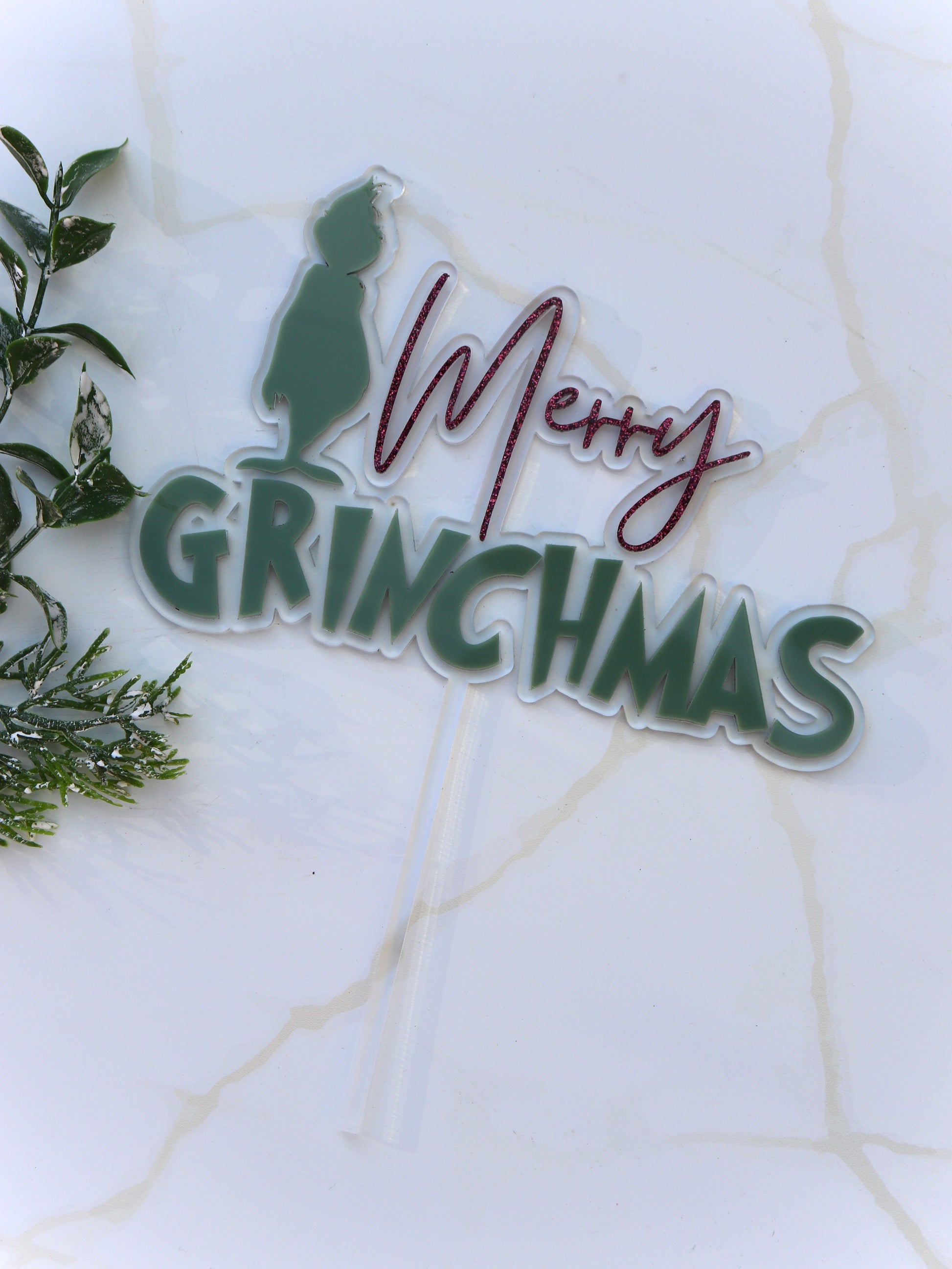 Our Merry Grinchmas cake topper will remain the same design and colours as per the photo. Double Layered, Frosted Clear, Olive Green and Glitter Red Acrylic.