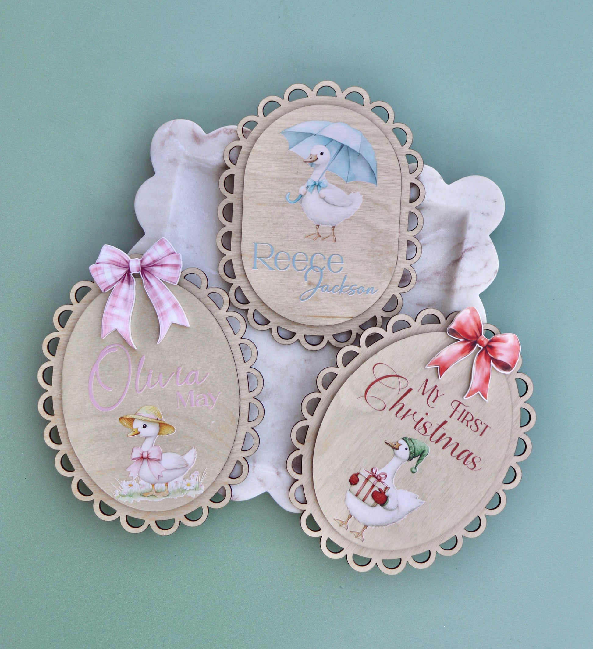 Each piece is crafted from high-quality varnished plywood and finished with a double-layered design, adding depth and warmth. The plaque is UV printed to capture every delicate detail of our sweet goose illustration, bringing a soft festive touch to your nursery or Christmas display.