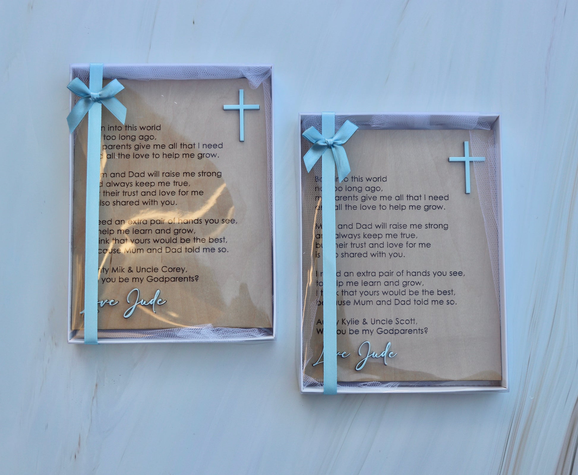 Features: Engraved Varnished Plywood with Acrylic Cross and Name